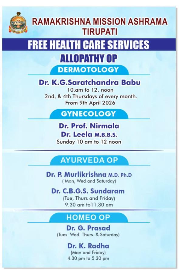 A free Allopathy, Ayurvedic, Homeopathic Dispensary is being run at the Ashrama for the benefit of the people in and surrounding areas of Tirupati.