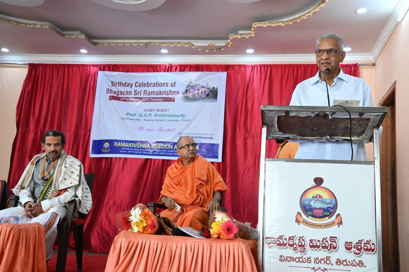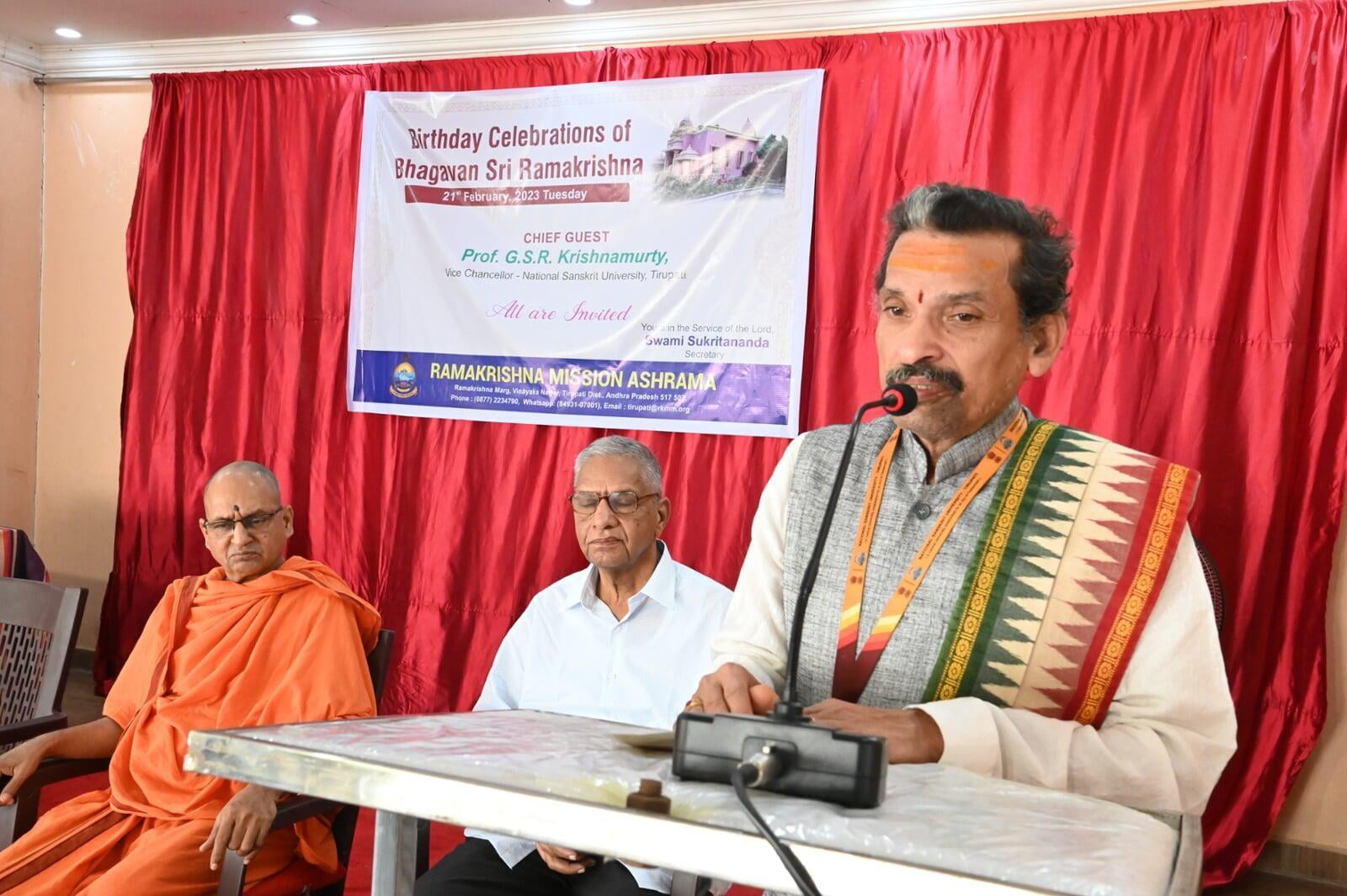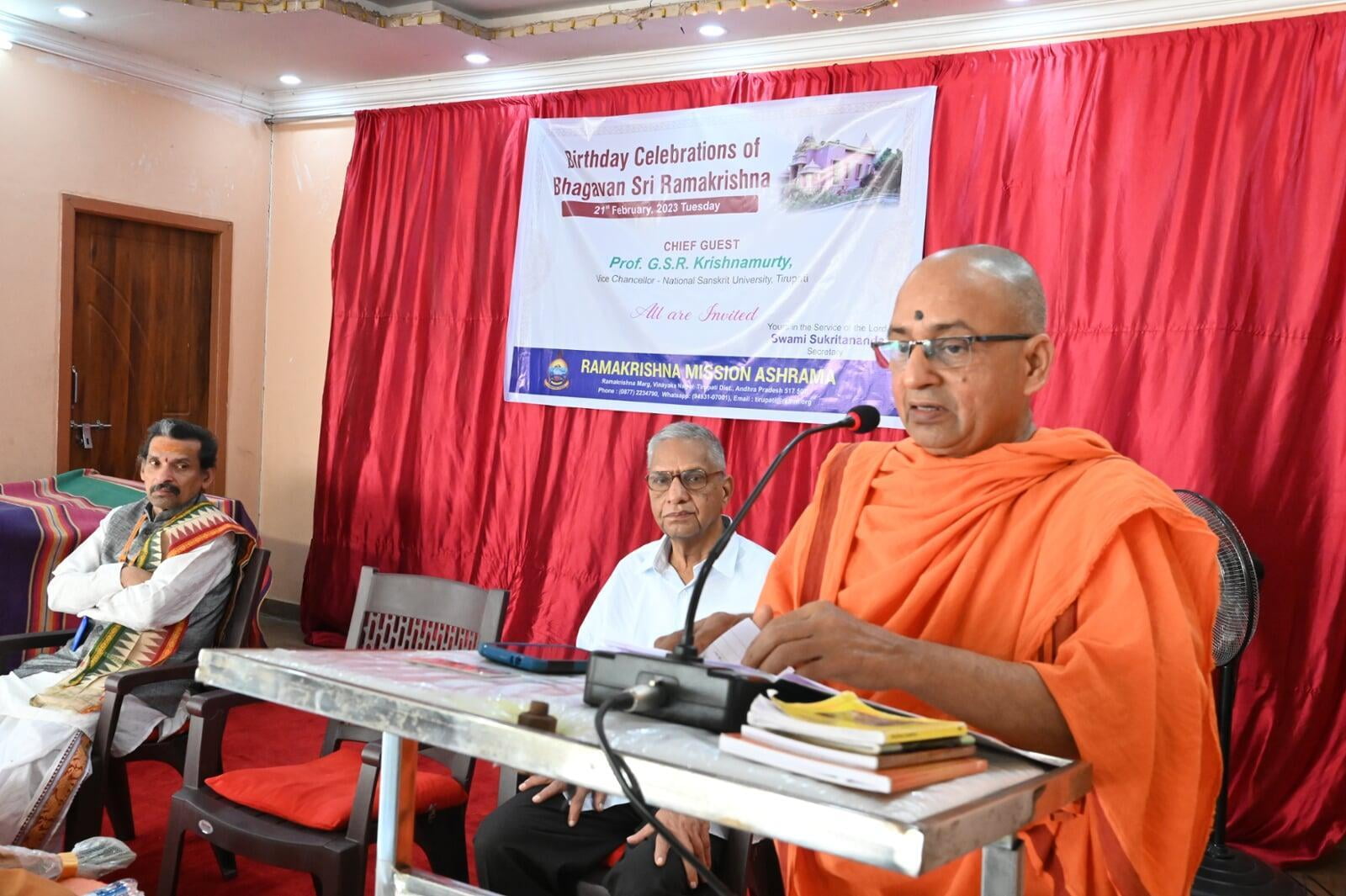 The meeting was presided by Swami Sukritanandaji, Ashrama Secretary in which Prof. GSR Krishnamurthy, Vice Chancellor of National Sanskrit University is the Chief Guest. Speaking on the occasion Krishnamoorthy told everybody should chant “Sthapakayacha Dharmasya” sloka and know the meaning of it. Everybody should know our Dharma as in Upanishads, Gnana, Daya, Dharma, Dhana should be followed by us. Inspired by Sri Ramakrishna Swami, Vivekananda addressed in Parliament of Religions held at Chicago and showed the entire world “What is our Dharma”. He said Sri Rama Krishna showed the way for the world, which should be followed by us. We should do service to the society.
