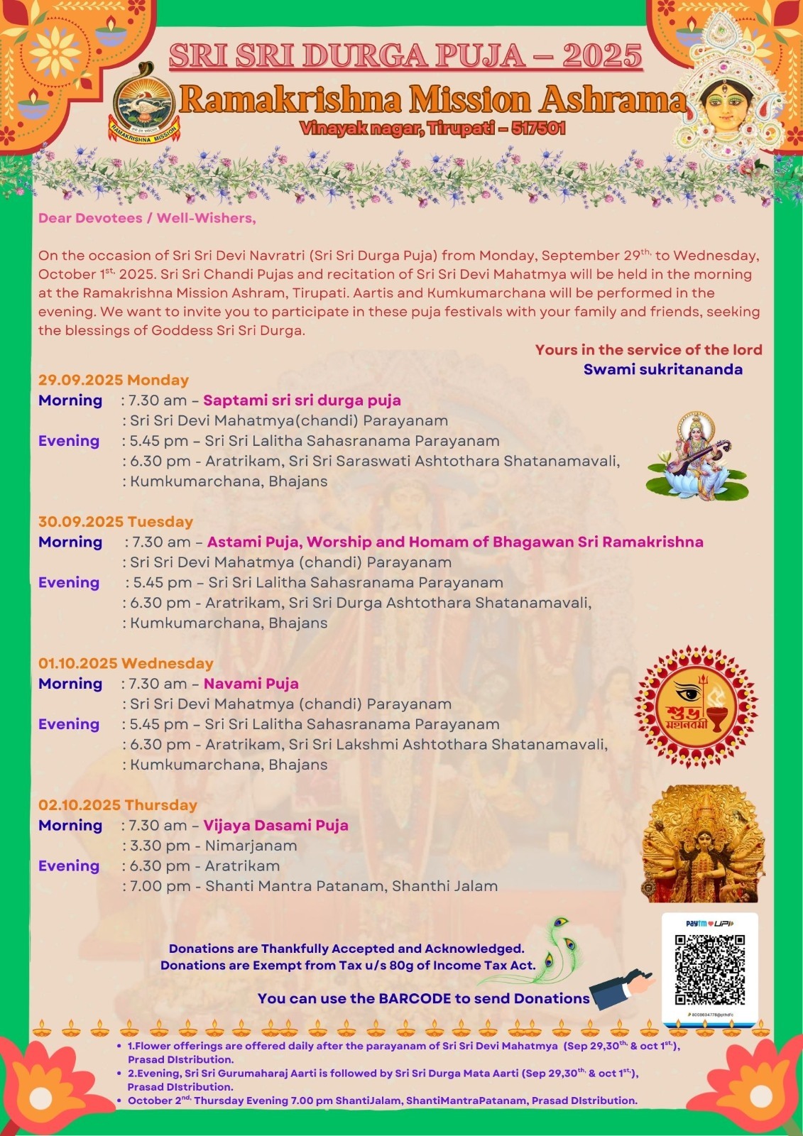 The Birthdays of Sri Ramakrishna, Sri Sarada Devi, Swami Vivekananda and Gurupurnima are celebrated in a grand manner every year. The celebrations are marked with special Puja, Homa, Bhajans, Musical programmes and Lectures. Prasad is distributed for hundreds of devotees who take part in the birthday celebrations. Narayana Seva- Poor feeding, distribution of clothes and blankets, etc. is also undertaken.